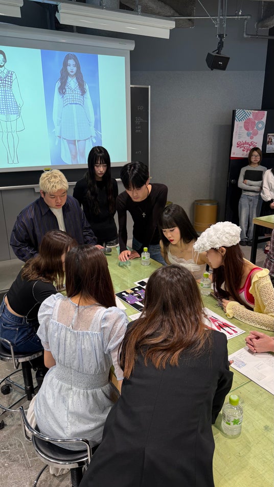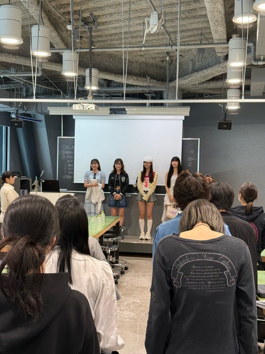 ■今回の取り組みについて「今回、私たちは、アイドル衣装のデザインからパターン作成、トワル制作まで一貫して携わるという貴重な経験をさせていただきました。衣装を通じて、同世代で活躍されるアイドルの方々を応援したいという思いのもと、公式イベント等でも着用できるフォーマルな雰囲気を意識して取り組みました。制作の過程では、事務所の方やメンバーへのプレゼンテーションの機会をいただき、フィードバックをもとにブラッシュアップを重ねて意見交換を交わしました。衣装が形になっていく過程を学ぶことができました」