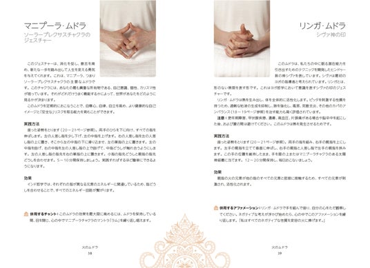 古代インドの科学に基づきながらも、現代のライフスタイルに適した70以上のムドラを紹介する、実践的なムドラガイド。精神的な鋭敏さを高め、心を落ち着かせるムドラ、ストレスを発散させ、他者と繋がるためのムドラ、活力を増したりリラックスしたりするためのムドラ、一般的な病気の症状を和らげるためのムドラなど、多彩なムドラをわかりやすく解説しています。