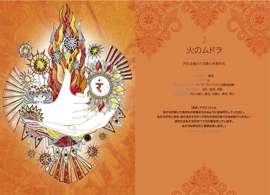 本書では、5 本の指と手のひらに関連するムドラに焦点を当てています。 それぞれの指はインド哲学の五大元素のエネルギーに対応し、手のひらは「心」に対応しています。