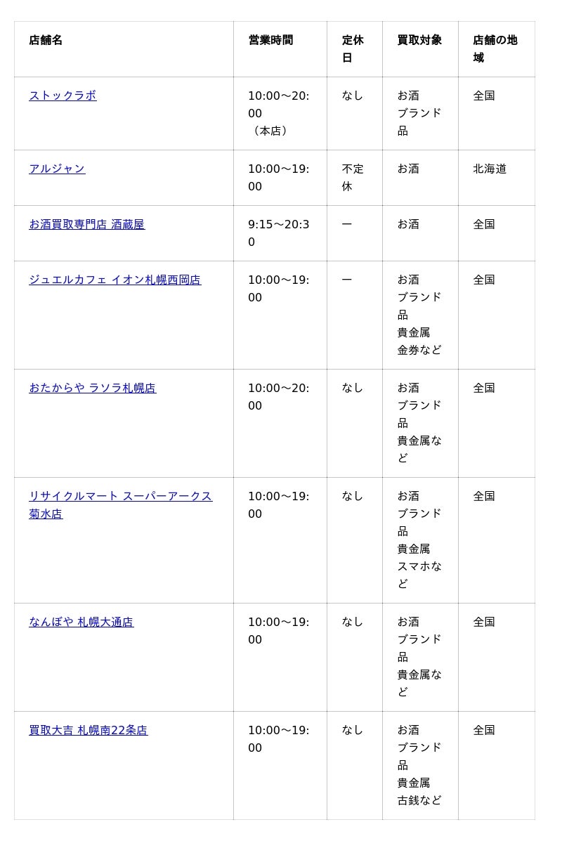 北海道でお酒を売る場合、公式サイトでお酒の買取実績を公開している業者がおすすめです。できれば、買取日、具体的な買取店舗名、買取金額、詳しいお酒の銘柄など、より詳細な情報まで詳しく書いている店舗が理想的です。