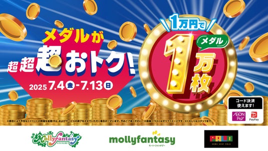 株式会社イオンファンタジー(本社:千葉県千葉市、代表取締役社長:藤原徳也、以下、当社)は、7月4日(金)より10日間の期間限定で、全国の「モーリーファンタジー」「PALO」をはじめとする当社のアミューズメント施設において、圧倒的にお得なメダルイベント「1万円でメダル1万枚」を開催いたします。人気のメダルゲームを心ゆくまでお楽しみいただけるよう、通常の貸出枚数を大幅に上回るメダルを貸し出しする、年に数回のスペシャルイベントです。