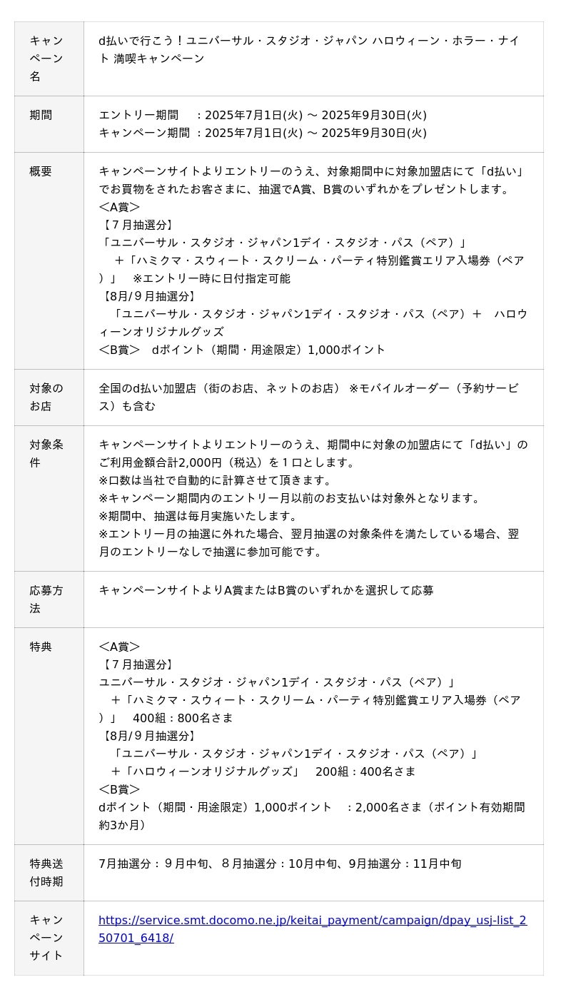 株式会社NTTドコモ(以下、ドコモ)は、全国の街のお店・ネットのお店※1で「d払い(R)」※2をご利用したお客さまを対象に、「ユニバーサル・スタジオ・ジャパン1デイ・スタジオ・パス(ペア)」や「dポイント(期間・用途限定)1,000ポイント」が抽選であたる「d払いで行こう!ユニバーサル・スタジオ・ジャパン ハロウィーン・ホラー・ナイト 満喫キャンペーン」(以下、本キャンペーン)を2025年7月1日(火)から2025年9月30日(火)までの期間で開催いたします。
