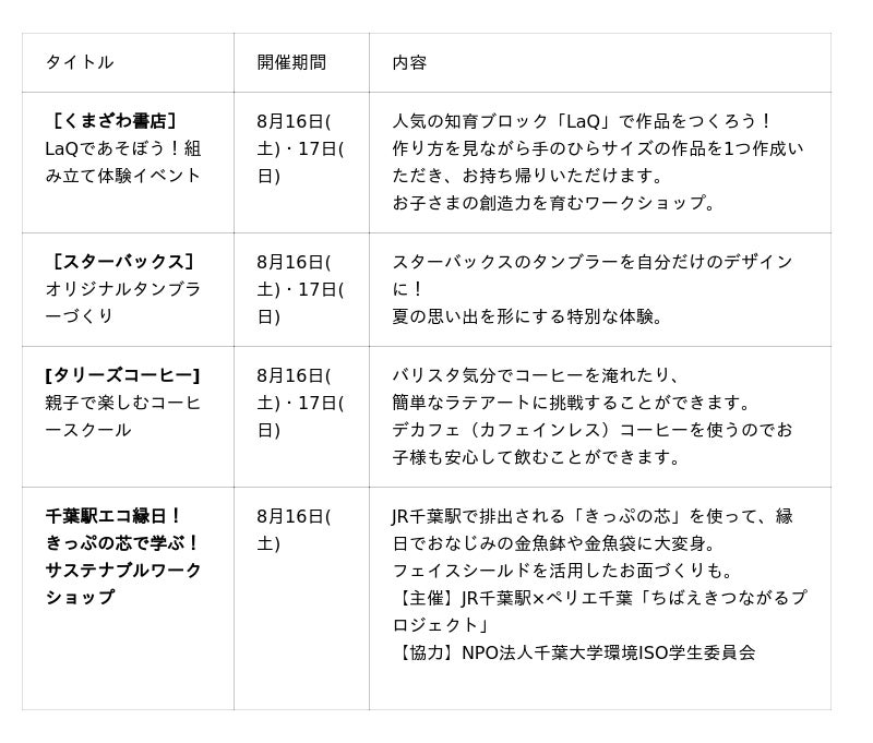 「買い物」+「出会い」+「体験」の3つのキーワードをテーマに、豊富なシーズンアイテムが揃うPOP UP SHOP、ペリエ千葉の飲食店で使用できるLINEクーポンプレゼント、夏休み中の受験・資格試験勉強を応援する自習室、開催3回目となる「きっぷの芯」を活用した人気ワークショップ等、親子で学んで遊べる体験イベントをご用意します。
