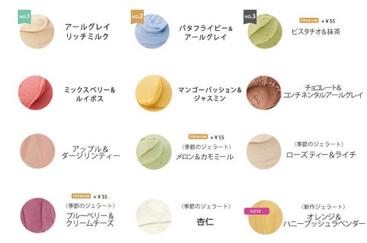 商品名:香るティージェラート価 格:ダブル ¥688(税抜¥625)/トリプル ¥798(税抜¥725)種 類:12種類からお選びいただけます。