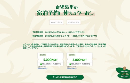 楽天トラベルページ内に開設する特設ページでは「アクティビティ」「グルメ」「絶景」「離島」「定番スポット」のカテゴリで約30スポットを紹介。また、ページ内にて⿅児島県内の宿泊施設で利用可能な割引クーポンを配布することで、観光客の来訪を直接的に後押しします。