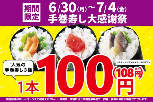 大好評につき再登場!お買い得!「手巻寿し大感謝祭」!手巻寿し人気の3種類を【特別価格】100円!(税込108円)で販売します!
