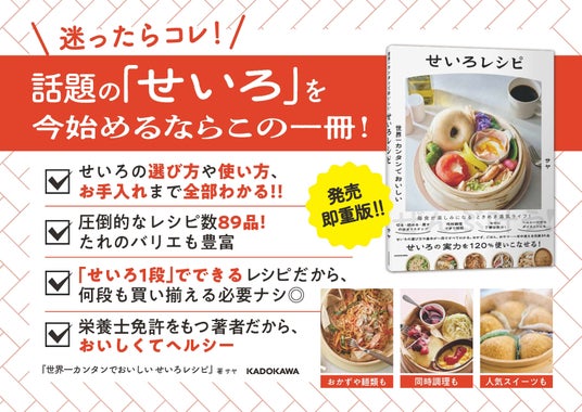 株式会社KADOKAWA(取締役 代表執行役社長 CEO:夏野剛、本社:東京都千代田区、以下KADOKAWA)が2025年2月15日(土)に刊行した『世界一カンタンでおいしい せいろレシピ』(著者:サヤ)は、「第12回 料理レシピ本大賞 in Japan 2025」料理部門・大賞の一次選考を通過いたしました。