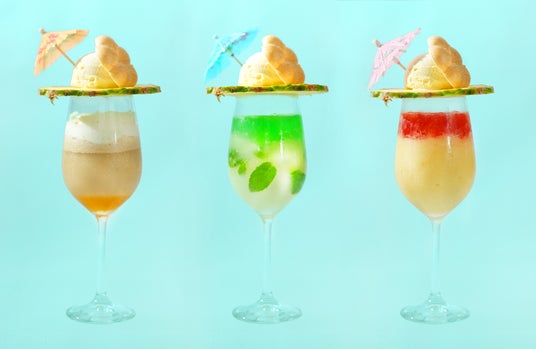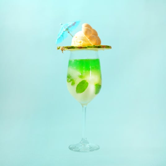 梅モヒートをフローズンに仕上げたフラッペ層、梅とハッカのジュレ層を重ねソーダを注ぎ、スライスしたパイナップルとアイスに梅最中とパラソルを添えました。スーッと刺激的で爽快な涼を楽しむ梅酒カクテルフラッペです。「The CHOYA FRORISTA トロピカル」