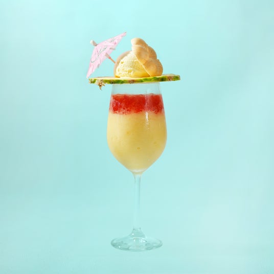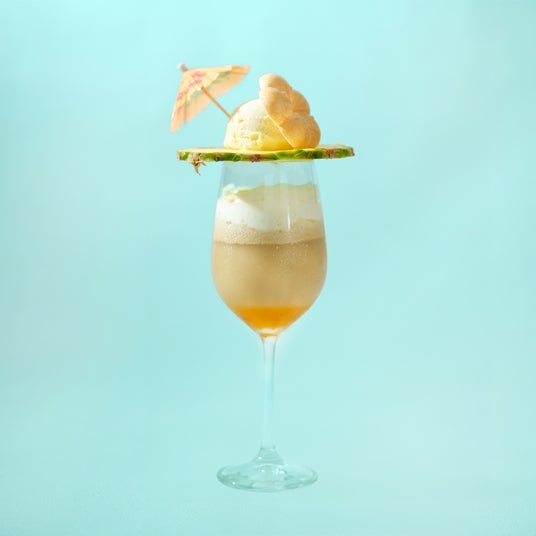 梅酒とパイナップルとマンゴーを合わせたフラッペ層に完熟南高梅やクランベリーでつくったジュレ層に重ねソーダを注ぎ、スライスしたパイナップルにアイスを乗せて梅最中とパラソルを添えました。すっきりとした酸味とジューシーで濃厚な果実感が楽しめる梅酒カクテルフラッペです。