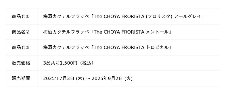 チョーヤ梅酒株式会社 (本社:大阪府羽曳野市、社長:金銅重弘、以下チョーヤ) は、梅酒カクテル専門店「The CHOYA 銀座BAR (ザ チョーヤ ギンザバー) 」にて、暑さが厳しい真夏に涼を感じて暑さを和らげる時間を提供する事を目的に開発したフローズンタイプの梅酒カクテルフラッペ「The CHOYA FRORISTA (フロリスタ) 」から「アールグレイ」、「メントール」、「トロピカル」、の3種類を2025年7月3日 (木) から2025年9月2日 (火) まで期間限定で販売します。