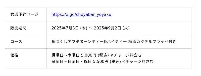 ■期間:2025年7月3日~9月2日100種類以上のドリンクが飲み放題!梅づくしアフタヌーンティーのデザートにも!(予約URL: https://x.gd/choyabar_yoyaku )