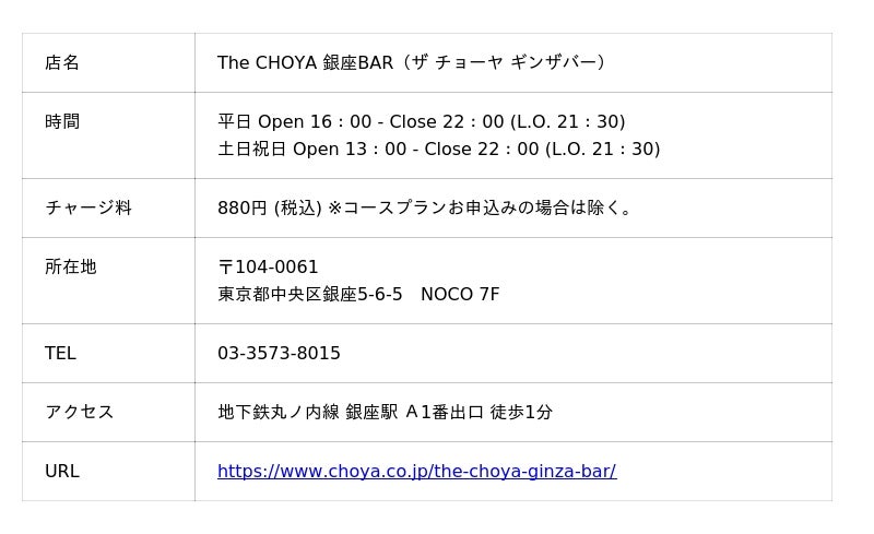 The CHOYA 銀座BARでは、お客様に「常に梅との新しい出会い」をお届けする事をコンセプトにこれからも運営して参ります。梅気分の際には、お気軽にお立ち寄りください。