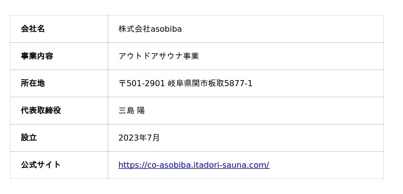 株式会社asobibaは、「最高の人生には最幸の休日」をミッションに掲げるアウトドア事業会社です(本社:〒501-2901 岐阜県関市板取5877-1、代表取締役:三島陽、設立:2023年7月)。