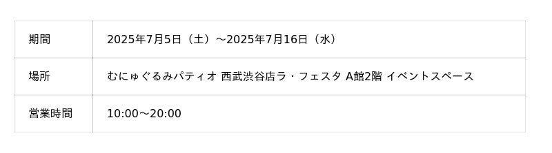「むにゅぐるみパティオ」公式ECサイトでも7月5日(土)11:00~より受注販売を開始いたしますので、ぜひこの機会にお買い求めくださいませ。