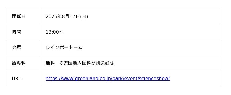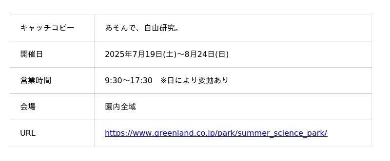 グリーンランドリゾート株式会社(本社:熊本県荒尾市下井手1616、代表取締役:松野隆徳)は2025年7月19日(土)より「まなつの大実験ゆうえんち」を夏季限定で開催します。