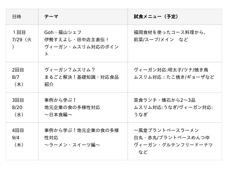 「食の王国・福岡」の魅力を世界へ!全4回、食の多様性対応を試食で体験!基礎知識・レシピ・食材調達・県内企業の取組事例まで幅広く学べます。試食だけ、複数回参加も大歓迎!