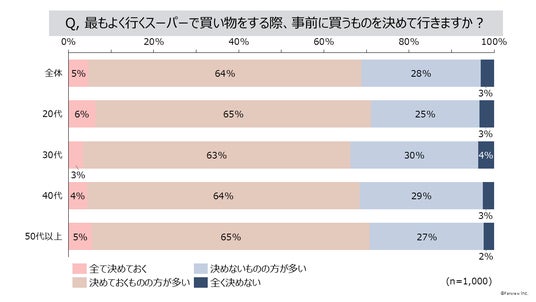 - 最もよく行くスーパーで買い物をする際は事前に買うものを「決めていくものの方が多い」64%