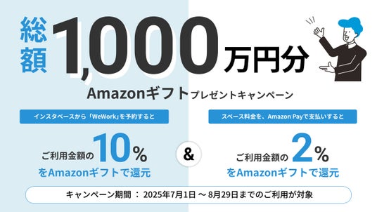 株式会社Rebase(本社:東京都渋谷区、代表取締役:佐藤 海)が展開するレンタルスペースのマッチングプラットフォーム「instabase(インスタベース)」は、WWJ株式会社(本社:東京都港区、代表取締役社長 兼 CEO:熊谷 慶太郎、以下「WeWork Japan ※1」)が日本国内で展開するフレキシブルオフィス「WeWork」から東京4拠点・大阪1拠点のスペースを新たに掲載開始しました。これにあわせて、対象の「WeWork」をご利用いただいたお客様を対象に、Amazonギフトをプレゼントするキャンペーンを2025年7月1日(火)より実施します。