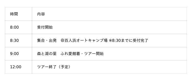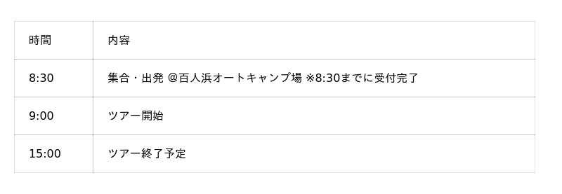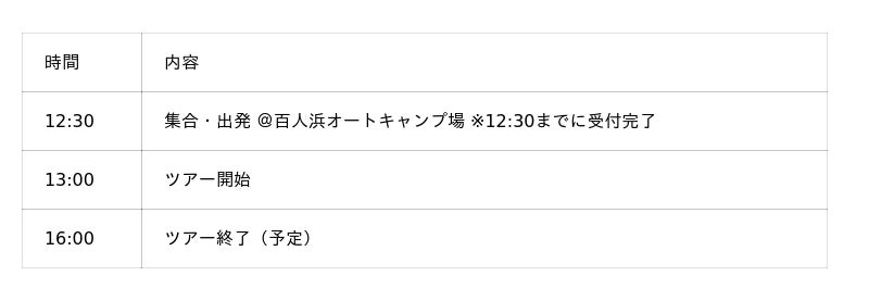 - 集合時間・場所:ツアー開始時刻の30分前までに百人浜オートキャンプ場受付集合
