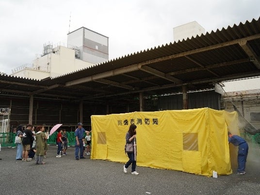 跡地に建設予定の新たな施設は避難場所等として活用が予定されており、これに伴い防災意識を高めるためのプログラムを開催しました。川崎市男女共同参画センター「すくらむ21」による防災展示や、高津消防署による煙体験ハウスが実施された他、高津警察署や自衛隊川崎出張所といった地域の行政団体も参加し、さまざまな催しが行われました。
