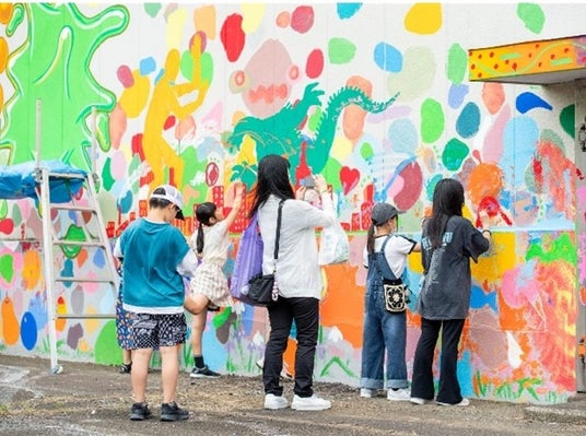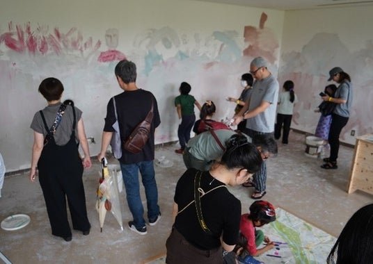 解体前の建物が1日限定のアートスペースに生まれ変わりました。本プログラムでは、敷地全体をキャンバスに見立て、解体建物の壁や床、窓、道路などに、過去への感謝や未来への期待を込めて、参加者一人ひとりに思い思いのアートを表現いただきました。