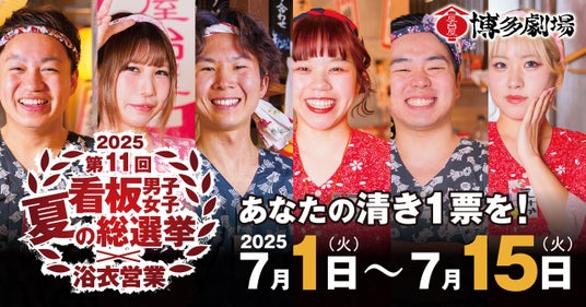 株式会社一家ホールディングスの連結子会社である株式会社一家ダイニングプロジェクト(本社:千葉県市川市、代表取締役社長:武長 太郎)が運営する、九州博多の風物詩"中洲の屋台村"の雰囲気と名物料理を楽しめる劇場型酒場『屋台屋 博多劇場』全50店舗で、2025年7月1日(火)~15日(火)の期間中、「看板男子女子総選挙~夏の陣~」を開催いたします。本イベントは、アプリ会員のお客様に「お店で最も輝いていたスタッフ(看板スタッフ)」に投票をしていただき、50店舗680名のスタッフの中で 男女上位7名、計14名の看板男子女子を選出します。恒例の人気イベントとなっており、今回で11回目の開催となります。夏の風物詩として人気の浴衣営業との同時開催で、より一層の盛り上がりを予定しています。