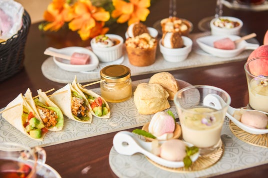 セイボリーには、ワカモレとチリコンカンの2種のタコスや、桃ジャムで楽しむスコーン、トリュフポテトなど、夏らしい軽食をラインナップ。甘さと塩味のバランスが絶妙で、最後の一口まで飽きずに楽しめます。