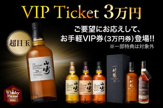 本チケットは、通常5万円(税込)のVIP券に対し、一部特典を除いた3万円(税込)でお買求めいただけます。一般ブースのウイスキーに加え、会場内のVIP専用ラウンジで山崎25年などの希少なウイスキー(※)をお愉しみいただける「お手軽VIP券」、この機会にぜひお求めください。