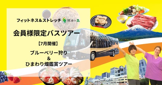 株式会社いーふらん(本社:神奈川県横浜市、代表取締役社長 鹿村大志、以下いーふらん)は、いーふらんが展開する「フィットネス&ストレッチ 健康の森」事業において、運動を通じた健康促進のみではなく、体験を通じたこころの充足、人と人とのつながりを「遊びながら」創出する会員限定バスツアーにおいて、7月は「ブルーベリー狩り&ひまわり畑鑑賞ツアー」を開催することをお知らせいたします。