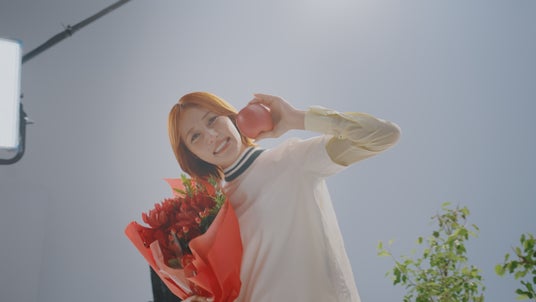 白いワンピースに身を包み、笑顔で撮影現場に入られた王林さん。終始天真爛漫な姿で、劇中の歌を口ずさんだり、周囲のスタッフともコミュニケーションをとるなど、明るく盛り上げてくださる姿が印象的でした。ひとたびカメラが回ると、様々なカットに対して瞬時に対応されており、細かい表情やりんごの角度にもこだわるなどプロフェッショナルな一面も。特に劇中歌に合わせて歌うシーンでは、いくつものパターンを変えて撮影されるなどアーティストの一面もうかがえるシーンとなりました。