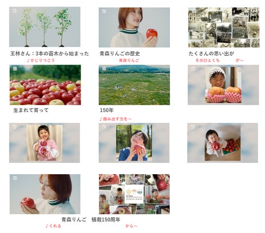 まずは、真っ白な空間の中で青森りんごの始まりを表す3本の苗木と王林さんのシーンからスタート。そこから、青森りんごの長い歴史を表す写真が重なっていき、現在のりんご農園の景色へとつながります。また、テーマソングは今回のための書き下ろし。歌詞にもご注目いただきながら、映像と音楽、その両方をお楽しみください。