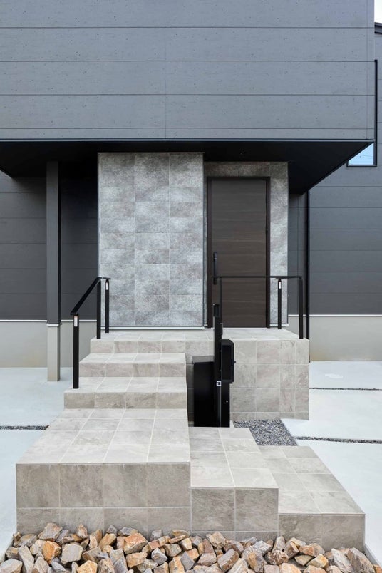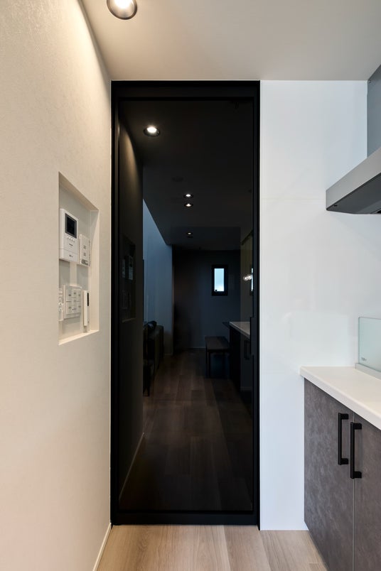 メインの外壁はブラックでまとめつつ、玄関周辺にはアクセントとしてダークグレーのストーンタイルで意匠性を持たせました。家具やキッチン小物はもちろん、照明やサッシなどの細かい部分もブラック×グレーで統一することで一体感のある仕上がりになっています。