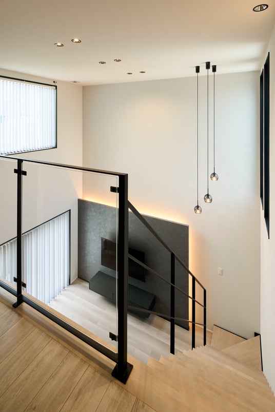 リビングの2面に窓を設置することで採光の取れた明るいリビングに。またスケルトン階段に加え、2階の手すりはガラスにすることで視界が抜け、より開放感のある空間になっています。