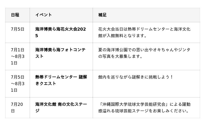 海洋博公園では、園内の最新情報やイベント情報をお届けする広報誌『美ら海通信』2025年7月号を発行いたしました。本号では、海洋博美ら海花火大会2025や夏休みのイベントなど様々なプログラムを紹介しております。