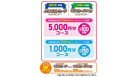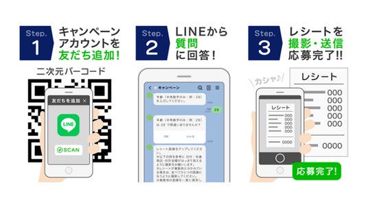 キャンペーン期間中に、ご希望のコースのご応募に必要な金額分の、対象商品のご購入レシート(複数枚可)で、はがきまたはLINEからご応募いただけます。