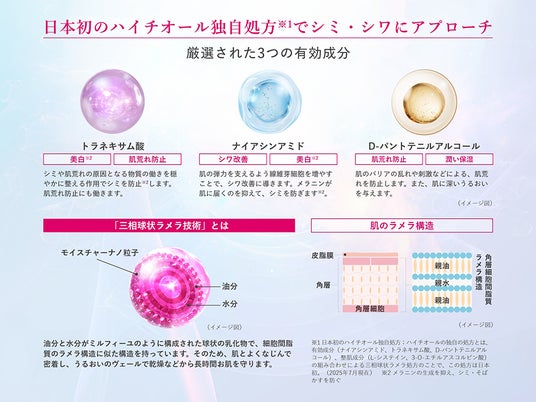 ※1 有効成分(ナイアシンアミド、トラネキサム酸、D-パントテニルアルコール)、整肌成分(L-システイン、3-O-エチルアスコルビン酸)の組み合わせによる三相球状ラメラ処方のことで、この処方は日本初。(2025 年 7 月現在)※2 メラニンの生成を抑え、シミ・そばかすを防ぐ