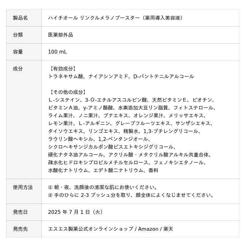 エスエス製薬株式会社(本社:東京都新宿区、代表取締役社長:ニクヒレッシュ・カルラ)のハイチオールブランドは、2025 年 7 月 1 日(火)に、薬用導入美容液『ハイチオール リンクルメラノブースター』(医薬部外品)を EC 限定で発売します。多くの人が抱えるシミ・シワ悩みに着目し、日本初のハイチオール独自処方で美白とシワの改善を同時に実現できる商品設計にしています。厳選された3つの有効成分「トラネキサム酸」、「ナイアシンアミド」、「D-パントテニルアルコール」を配合し、美白、シワ改善、肌荒れ防止、潤い保湿の4つの機能を持つ「ハイチオール リンクルメラノブース