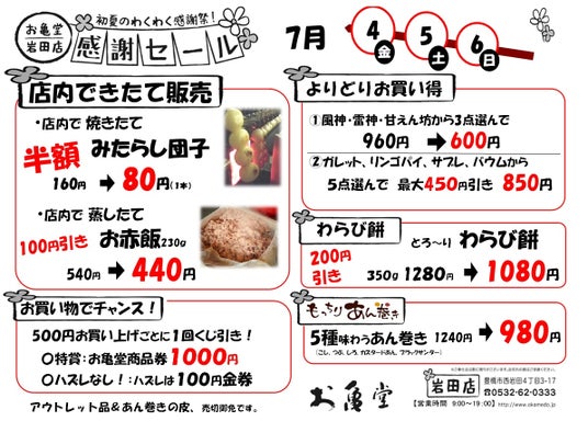 愛知県三河地方で70年以上愛される老舗和菓子店・株式会社お亀堂(本社:愛知県豊橋市/代表取締役:森貴比古)は、岩田店にて7月4日(金)~6日(日)の3日間、「感謝セール」を開催します。