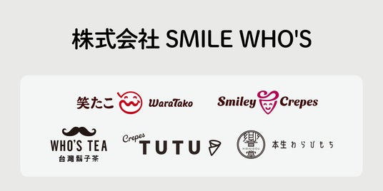 本合併により、3社が運営する関西風たこ焼き店「笑たこ」、クレープ専門店「スマイリークレープ」、クレープ&ドリンク専門店「TUTU」、台湾発祥のグローバルティーカフェ店「WHO'S TEA」、本生わらび餅など和スイーツ専門店「響堂」という5ブランドがひとつの企業のもとに統合され、ブランド間の連携をさらに強化しながら、お客様にさらなる"食の楽しみ"を提供いたします。新会社「株式会社SMILE WHO'S」では、それぞれの既存ブランドが培ってきた魅力や強みを活かしながら、より強固な経営基盤と商品開発力をもとに、さらなるサービス向上と店舗展開を目指してまいります。