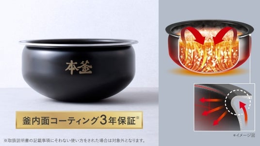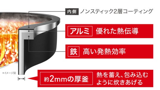 発熱効率の良い「鉄」と熱伝導に優れた「アルミ」を組み込み、釜内を素早く均一に加熱。内側は2層のノンスティックコーティングでごはんのこびりつきも防ぎます。