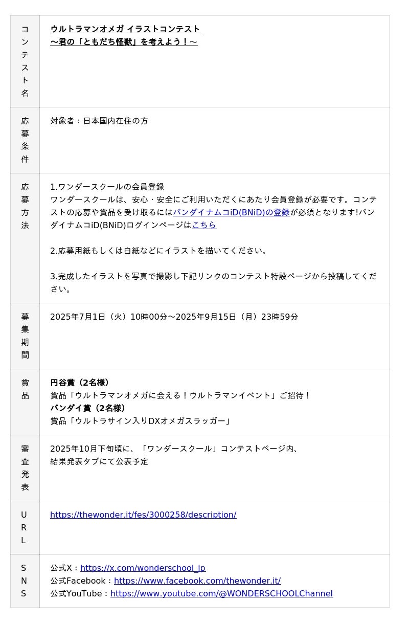 バンダイの参加型投稿サイト「ワンダースクール」 ウルトラマンオメガ放送開始記念! 応募期間:2025年7月1日(火)10時~2025年9月15日(月・祝)23時59分