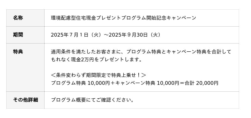 さらに、本プログラムの開始を記念して、9月30日まで特典金額が2倍となる特別キャンペーン(以下、本キャンペーン)を実施します。本キャンペーン期間中に適用条件を満たしていただいたお客さまには、追加で現金1万円を上乗せし、合計で現金2万円をプレゼントします。