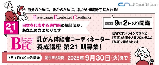 認定NPO法人キャンサーネットジャパン(東京都文京区 理事長 岩瀬 哲)は、乳がん医療に関する科学的根拠に基づいた正しい知識を身につけたいと考えている方を対象に、「第21期 乳がん体験者コーディネーター(Breast cancer Experienced Coordinator:BEC)養成講座」を2025年9月より開講、それに伴い受講申込を7月1日(火)より開始いたします。