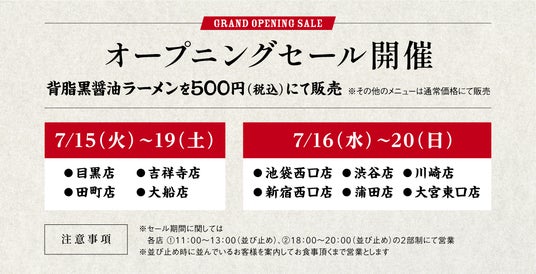 オープン記念といたしまして、オープンから5日間はメイン商品「背脂黒醤油ラーメン」を500円(税込)にてご提供いたします。