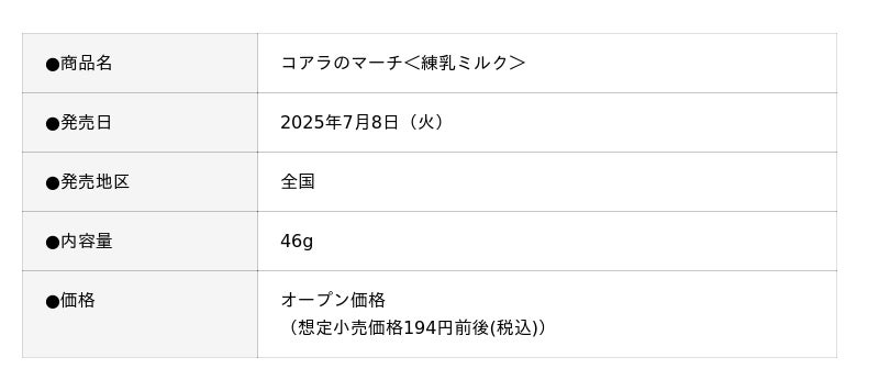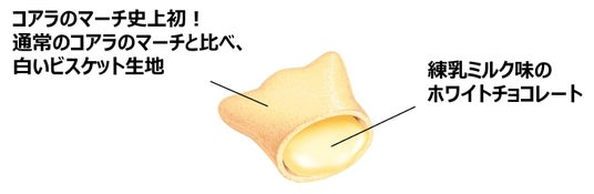 - コアラのマーチ史上初!通常コアラのマーチと比べ白いビスケット生地に、練乳ミルクをイメージした味わいです。