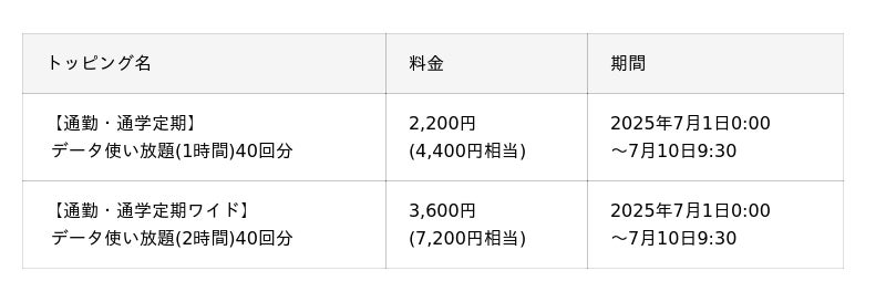 「通勤・通学定期」は、「データ使い放題(1時間)」40回分(4,400円相当) (注2) を半額の2,200円で利用できます。また「通勤・通学定期ワイド」は、「データ使い放題(2時間)」40回分(7,200円相当)(注3)を半額の3,600円で利用でき、状況にあわせて、おトクな2種類からお選びいただけます。日々の通勤・通学時間などでデータの使用量を気にすることなく動画視聴やSNSを利用したいお客さまにおすすめです。