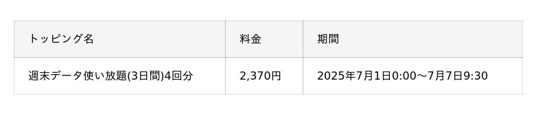 毎週木曜から月曜まで790円で提供している「週末データ使い放題(3日間)」の3回分の価格で4回分使うことができるおトクなトッピングです。期間中、曜日にかかわらず利用できるため、外出予定があるお客さまや、動画視聴やSNSなどを好きなタイミングで思う存分楽しみたいお客さまにおすすめです。