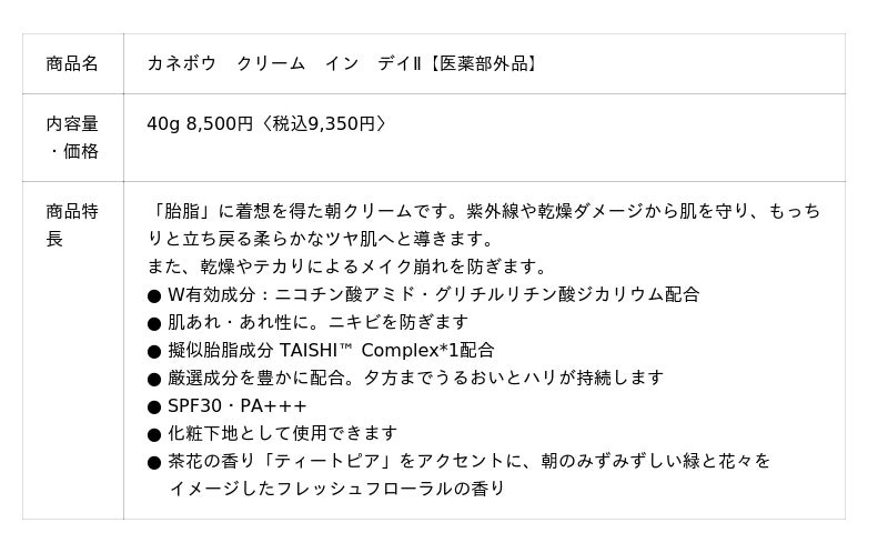 『カネボウ クリーム イン デイII』は、紫外線や乾燥ダメージから肌を守り、もっちりと立ち戻る柔らかなツヤ肌へと導く朝クリームです。有効成分ニコチン酸アミドとグリチルリチン酸ジカリウム配合で、肌あれやニキビを防ぎます。また、肌を乾燥から守る「胎脂」の擬似機能成分として開発された擬似胎脂成分「TAISHITM Complex*1」を新配合。表情豊かな日中の肌に寄り添う伸縮性の高い「オールデイシールド」塗膜技術により、朝の塗布後から夕方までうるおいを持続させ、乾燥やテカりによるメイク崩れを防ぎます。