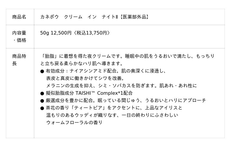 『カネボウ クリーム イン ナイトII』は、睡眠中の肌をうるおいで満たし、もっちりと立ち戻る柔らかなハリ肌に導く夜クリームです。有効成分ナイアシンアミドが肌の奥深くに浸透し、真皮と表皮にアプローチしてシワを改善。メラニンの生成を抑え、シミ・ソバカスを防ぎます。また、「胎脂」の擬似機能成分として開発された擬似胎脂成分「TAISHITM Complex*1」を新配合。水分蒸発量の多い夜の肌に密着し、ひたひたのうるおいで睡眠中の肌を包み続ける「オーバーナイトシールド」塗膜技術により乾燥から肌を守ります。