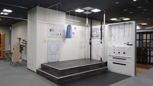 「hoss NAGAE Space TOKYO」「hoss NAGAE Space OSAKA」では、シンプルモダンなデザインと機能性を備えた物干し金物・天井突っ張りフレーム・壁面フックを中心に、"暮らしをととのえる"プロダクトを展示しています。ランドリールームを想定したシーンで、動作や操作感を実際に体験していただける構成です。